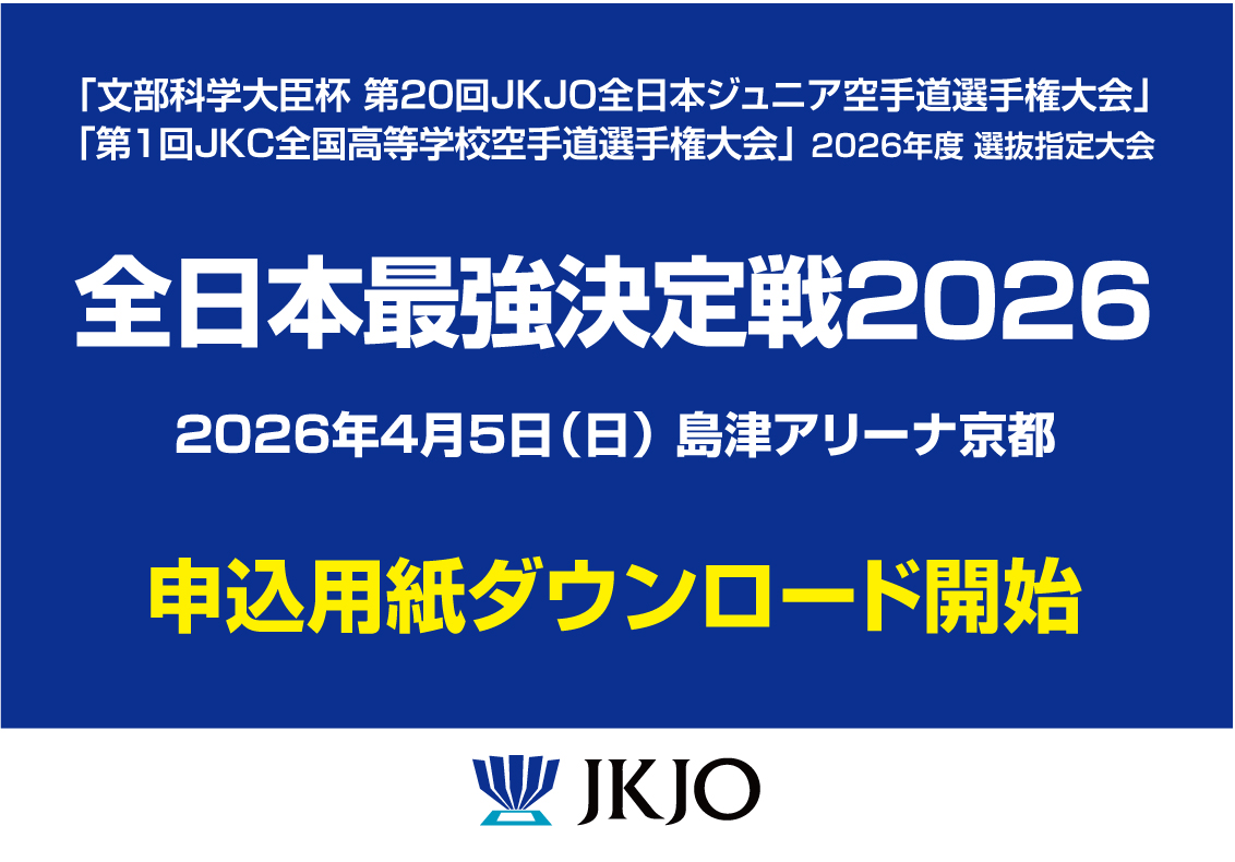 [日 時]令和8年4月5日(日) [会 場]島津アリーナ京都(京都府立体育館) [締 切]令和8年2月18日(水)必着 ※その他、詳しくは下記参加申込用紙一式をご参照下さい。 ▼各種ダウンロード▼ 参加申込用紙一式 エントリーフォーム 「文部科学大臣杯 第20回JKJO全日本ジュニア空手道選手権大会」及び、高校生の部は「第1回JKC全国高等学校空手道選手権大会」の選抜指定大会となります。申込用紙が別となっておりますのでご注意下さい。