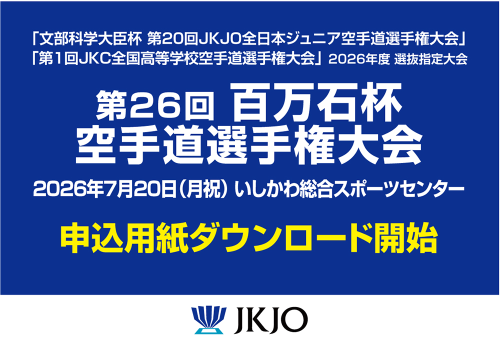「文部科学大臣杯 第20回JKJO全日本ジュニア空手道選手権大会」及び、高校生の部は「第1回JKC全国高等学校空手道選手権大会」の選抜指定大会となります。申込用紙が別となっておりますのでご注意下さい。