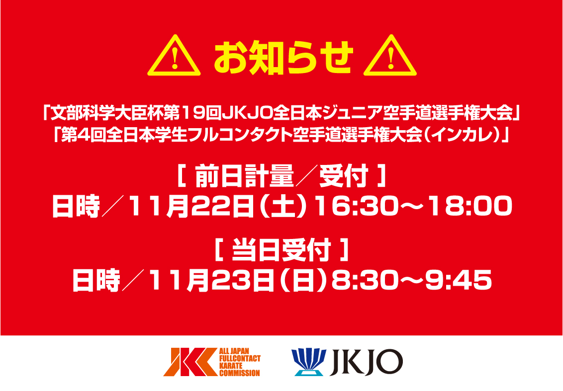 「文部科学大臣杯 第19回JKJO全日本ジュニア空手道選手権大会」及び「第4回全日本学生フルコンタクト空手道選手権大会」の、来場に際しての注意事項となります。必ずご一読の上ご来場下さい!