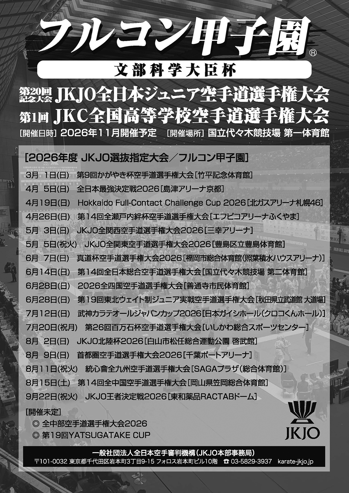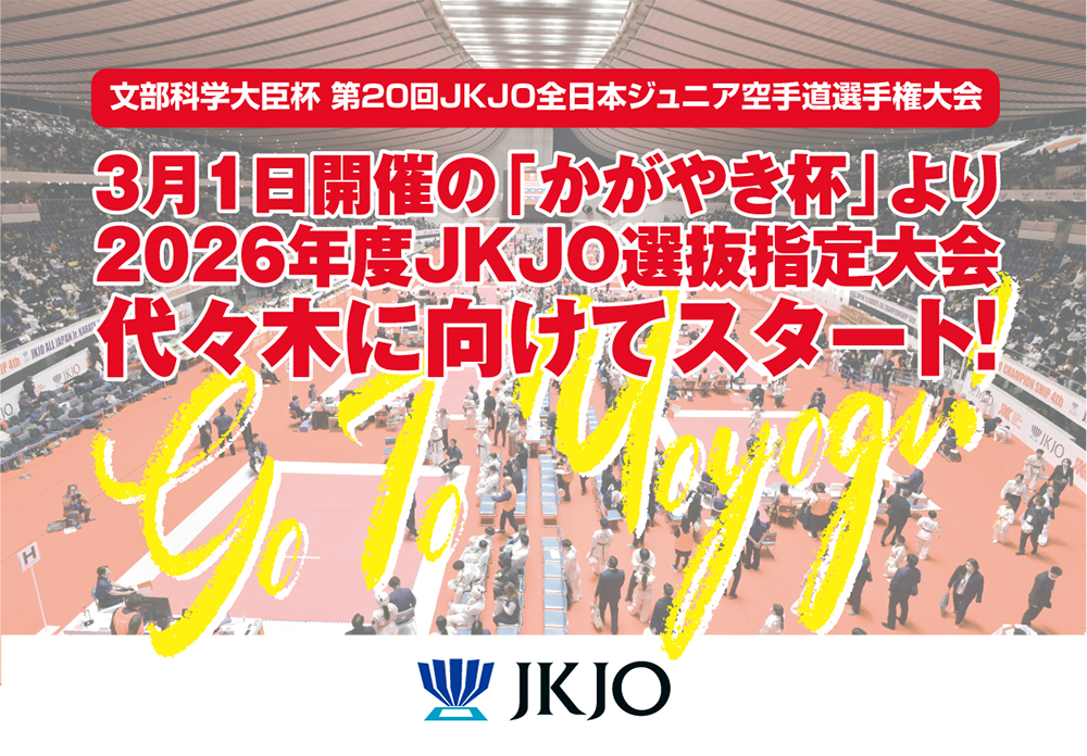今年のJKJO全日本ジュニア大会は、20回目となる節目の記念大会となります。フルコンタクト空手の聖地〝国立代々木競技場〟への権利をかけた、2026年度JKJO選抜指定大会が、いよいよ今週末開催の「第9回かがやき杯空手道選手権大会」より始まります。北海道から九州までJKJO選抜指定大会全19戦!代々木目指して頑張ろう! 20回記念大会 文部科学大臣杯 第20回JKJO全日本ジュニア空手道選手権大会 ▶2026年度JKJO選抜大会スケジュール