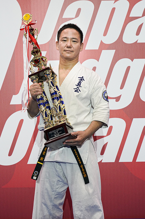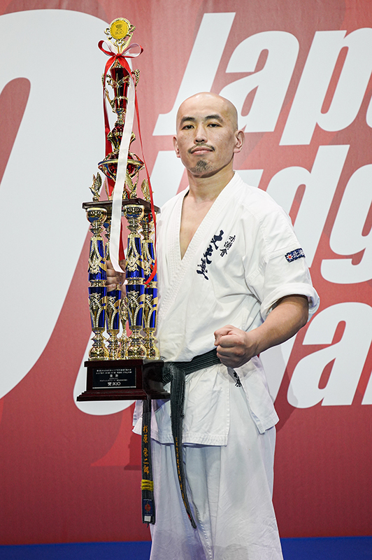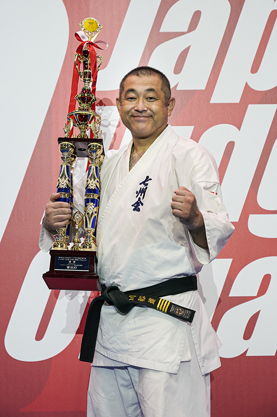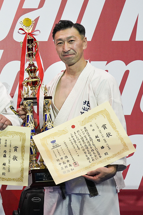 優勝できて、まずはホッとしています。今年で50歳、空手歴も30年でひと区切りの年と考えていました。5月のJFKO国際大会シニア、そしてこのJKJO全日本シニアが大きな目標となっていましたが、ともに優勝できて良い年にすることができました。5月のJFKO国際大会シニアで優勝した際には、新極真会でご指導いただいた外舘慎一師範にご挨拶でき、また祝福の言葉を頂戴し感無量でした。JFKO国際大会シニアで勝ったことから、空手仲間や道場生たちからはJKJO全日本シニアでも勝って当たり前のように言われていたのですが、同じ階級にはたくさんの強豪がいて、試合が始まる前から不安と緊張で身体が硬くなっていました。常に全力、そして精一杯の力を振り絞っての勝利でした。先にも申しましたが、年齢50、そして空手歴30という区切りの年に、JFKOとJKJOという日本を代表する2つのシニア大会で優勝できたこと、かつての恩師や現在の道場生、仲間たちに祝福を受けたことは大きな喜びになったとともに、今後の励みにもなりました。本当にありがとうございました。