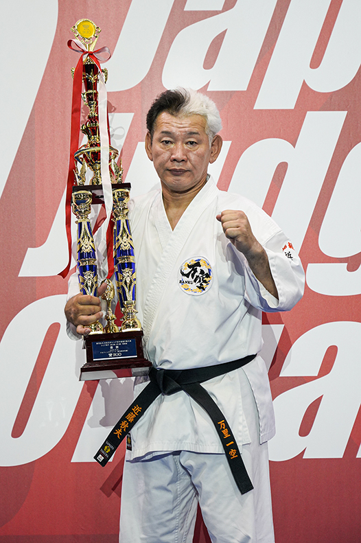 今回優勝して、50年空手を続けて誇れるタイトルを獲れたことをうれしく思っています。全日本で一度は優勝したかったですから(笑)。一般部の大会には32歳まで出場していたのですが、当時の組手のスタイルはガチンコでした。年を重ねるにつれ、受けと捌きを主体に自分の攻撃を正確に当てていくスタイルに変えていきました。決勝戦の中村清志選手(正伝流中村道場)は体幹の強さにびっくりしました。同年代で下段蹴りで体勢を崩せなかった方は初めてでした。私は『OYAJIバトル』に出場しているのですが、試合時間が1分なため、開始と同時にラッシュのようなテンポになってしまっており、今回の中村選手との決勝も1分半マスト判定だったので、同じようなペースで戦って優勝を決めたという感じでした。JKJO全日本シニアは今回が初めての出場でした。試合はコロナ禍を機に遠ざかっていたのですが、今年からまた出場し始めました。6月の桜塾の大会、7月の七州会の大会、そして今回のJKJO全日本シニアは復帰3戦目でした。実は、今大会に80歳を超える父と母が応援に来てくれていました。父が小学4年の時に私を道場に連れて行ってくれたことが空手との出会いとなり、この年になって優勝する姿を見せてあげることができて、良い親孝行ができたとこれもホッとしております。自分の道場の少年部の子どもたちが父母の声援を背に戦う気持ちも知ることができました。すばらしい大会を開催して下さったJKJOの方々には感謝しております。
