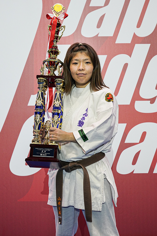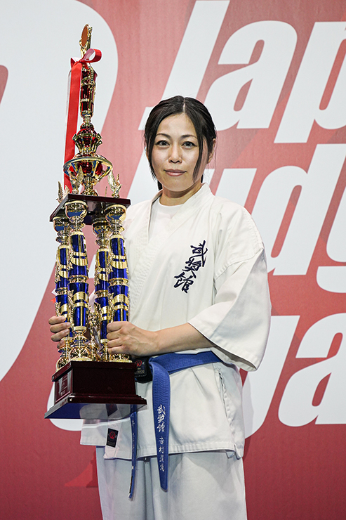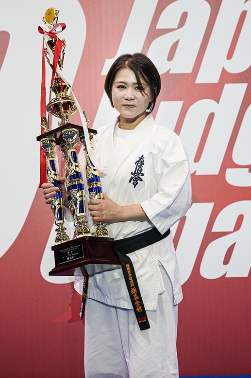 優勝して、子どもたちが胸を張って自慢できる母親になれてよかったです。シニアの大会に出たいという気持ちは3年前からずっとあって、今大会の1回戦で対戦した西山由里子選手(空會館)が優勝された昨年の試合は、会場で試合を見ていました。そのときに、強い人だなと思っていたと同時に、この人と戦いたいと強く思い、今回夢が叶いました。当時は家事や育児、介護に追われる毎日でしたが、そんな中でも日本一になれるというのを子どもたちに見せたかったというのがその理由です。この1年、道場の先生や先輩方に支えられ、道場と子どもたちとの自主練を含めて週に平均6日の稽古を続けてきました。今年、JKJOシニアは33歳になって初出場です。決勝後、西山選手からは優しい言葉をかけていただきました。私も優しいチャンピオンでいなければと教えていただいたような気持ちになりました。ここから稽古を続けて、2連覇を目指したいと思っています。