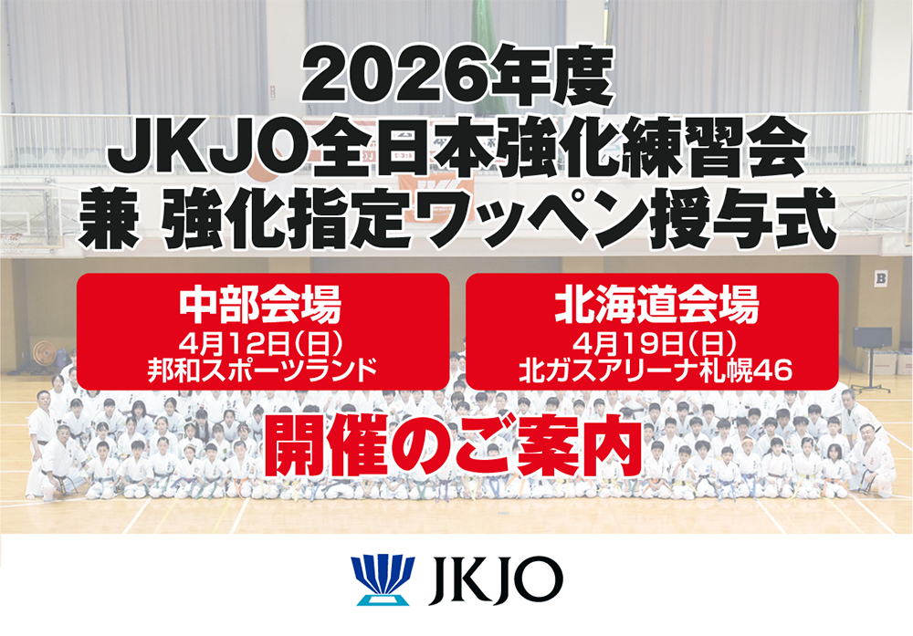2026年度の「JKJO全日本強化練習会 兼 強化指定ワッペン授与式」の開催が決定しました。参加選手へは2026年度のJKJO強化選手としてワッペンをお渡しし、記念Tシャツをプレゼント致します。たくさんの選手のご参加をお待ちしております。