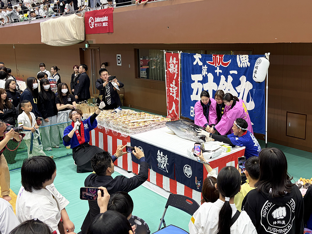 お昼休憩には会場内でマグロの解体ショーが行われ、目の前で捌かれた新鮮なマグロの握り約400貫が提供された。その他にも近江牛カレーやモスバーガーのチケット、アスリートに人気のコラントッテの磁気ネックレスなど様々な商品が選手たちに振る舞われた。