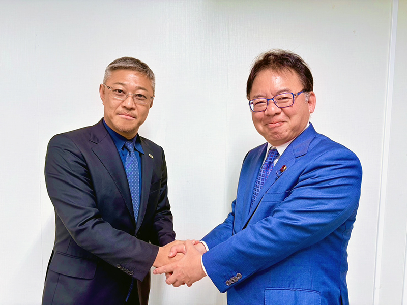 ▼厚生労働大臣の上野賢一郎先生と握手を交わす酒井代表